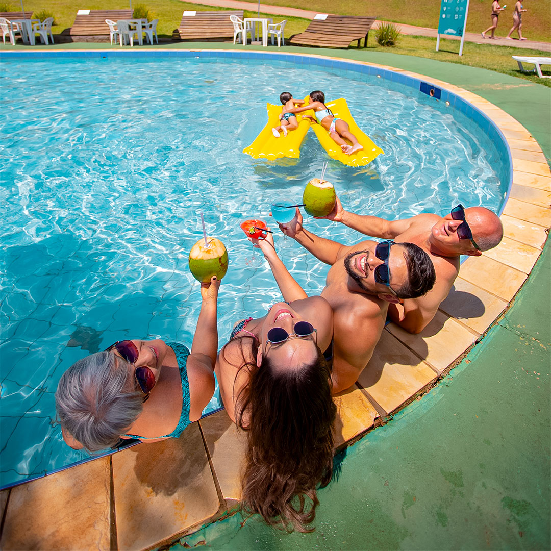 • • São 10 piscinas, todas com água termal a 45,5° direto da fonte, sendo elas: 07 piscinas externas e 03 piscinas internas.